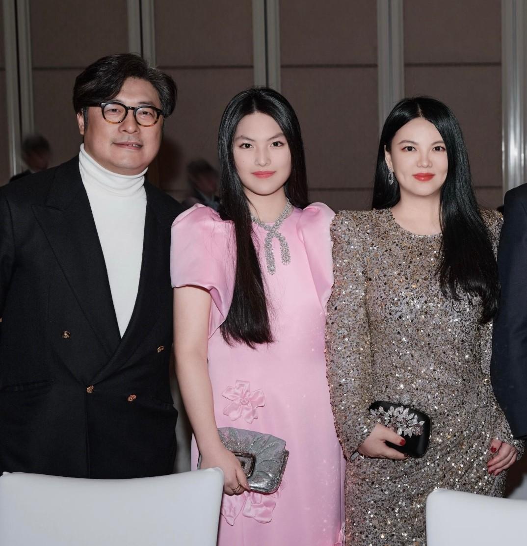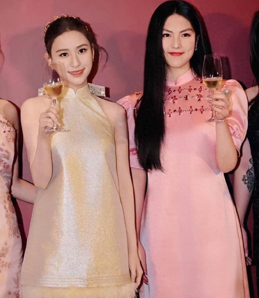 李湘携女儿出席晚宴。两个千金大小姐举杯靠在一起。左边是何超莲,她身穿白色短款礼裙。王诗龄在右侧,身穿粉色长礼裙。