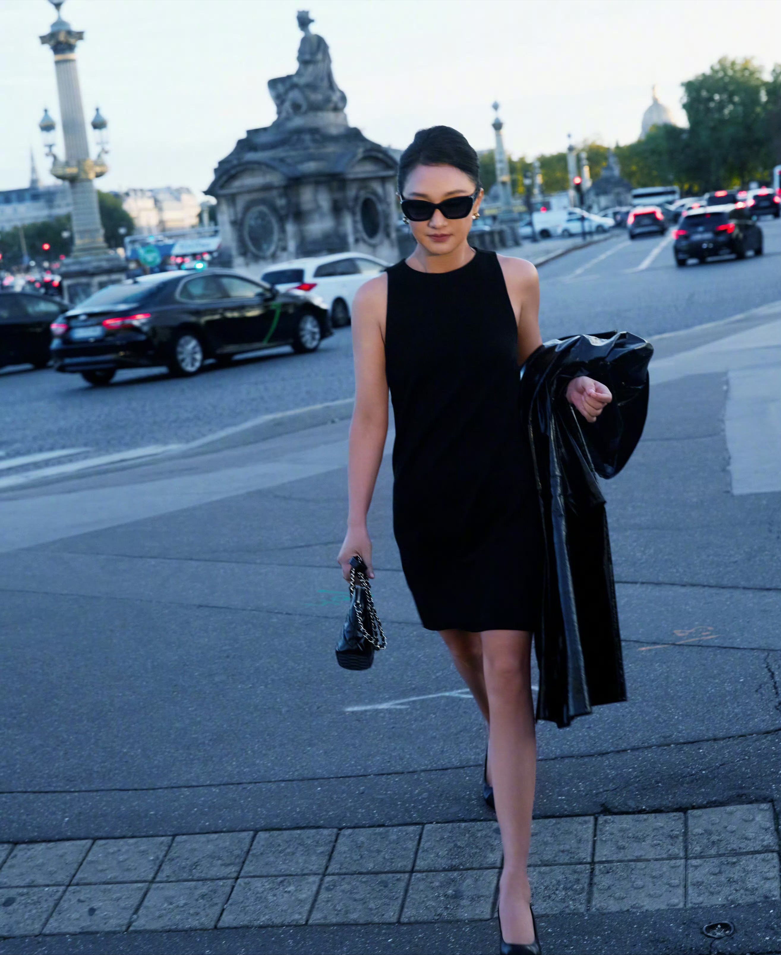 巴黎的晚风掠过塞纳河畔的石栏,周迅踩着细高跟走在街头,一袭黑裙将法式慵懒与东方灵秀揉成了独一份的风景。 无袖小黑裙勾勒出纤细的肩颈线条,简约的剪裁藏着高级的质感,手中菱格纹链条包轻轻晃动,金属光