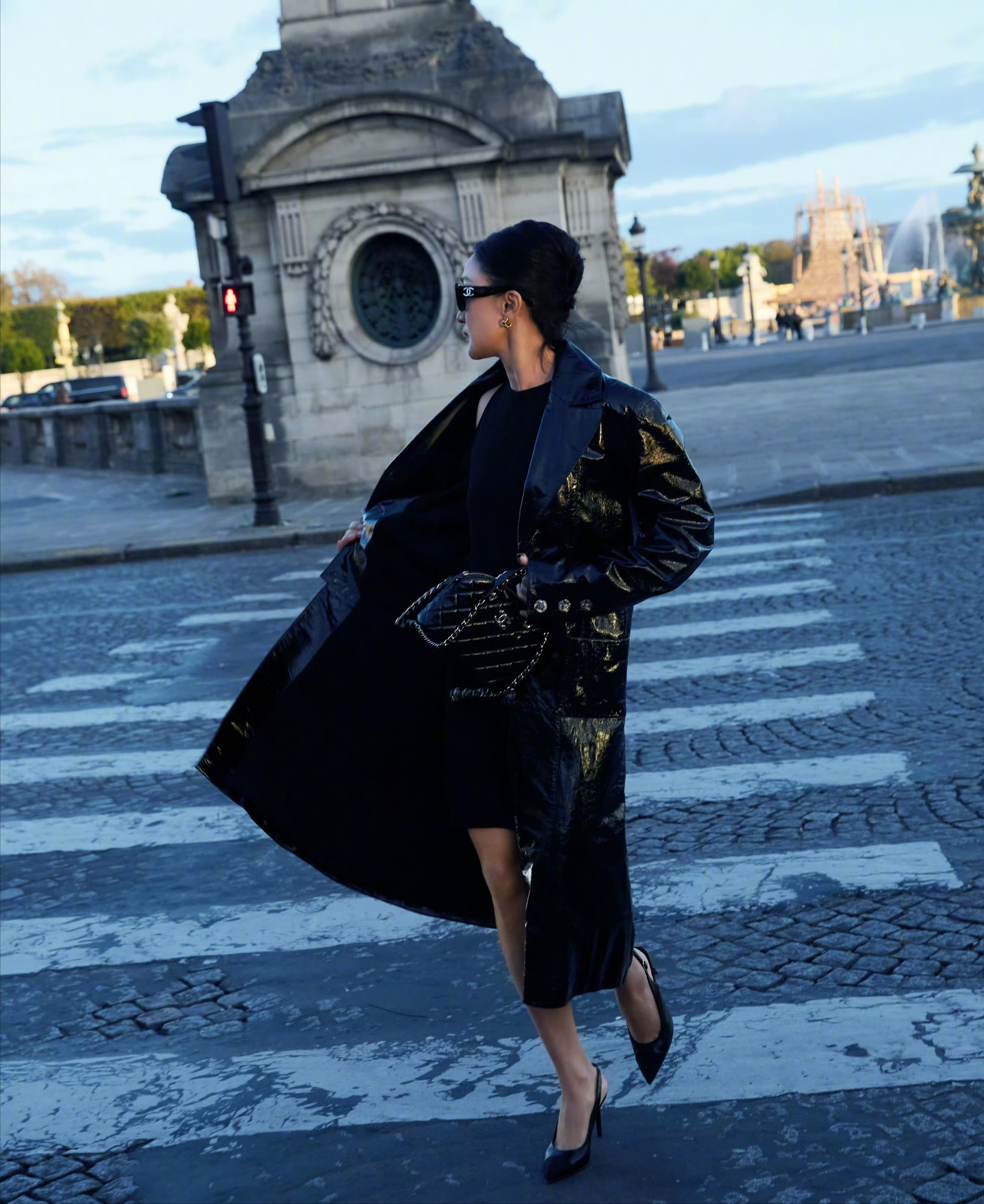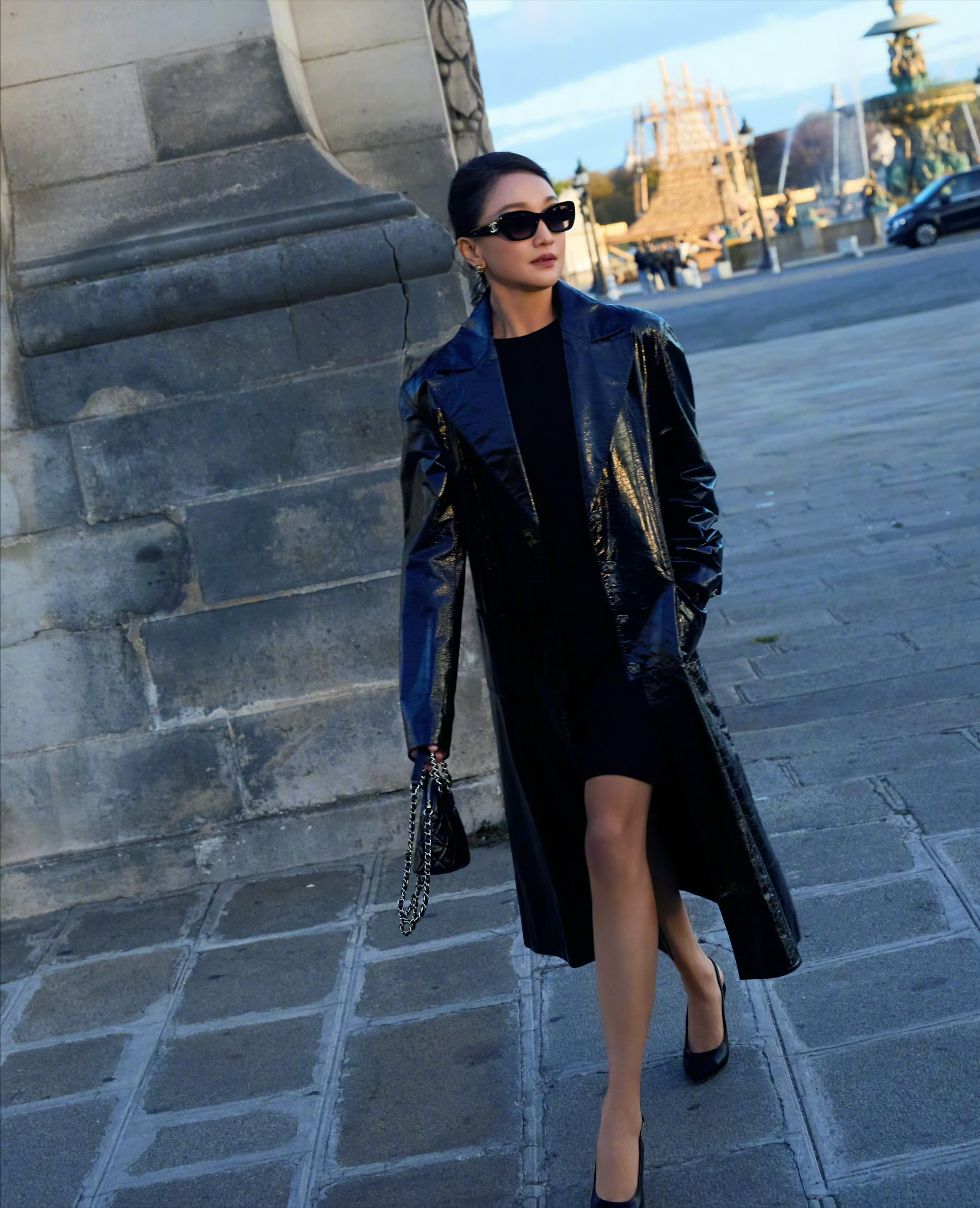 无袖小黑裙勾勒出纤细的肩颈线条,简约的剪裁藏着高级的质感,手中菱格纹链条包轻轻晃动,金属光泽与黑裙的哑光质感碰撞出精致的火花。亮面黑风衣被她随意搭在臂弯,行走间衣摆翻飞,酷飒与柔美在她身上达成奇妙的平衡。