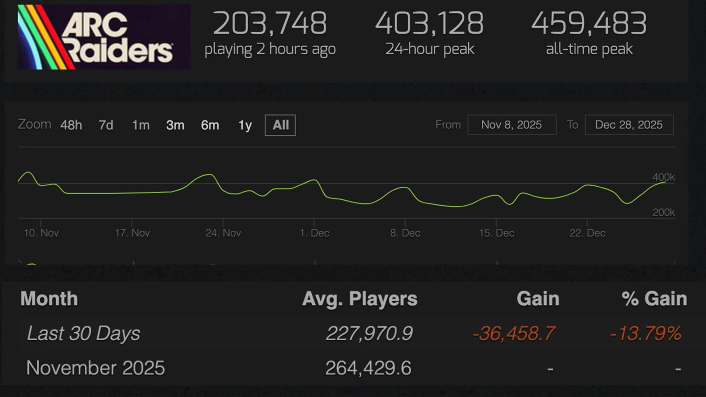 《Arc Raiders》于 10 月正式发售,并在 11 月 9 日创下 459,483 人的玩家峰值纪录。而自发售以来,该游戏的 24 小时玩家峰值最低也维持在 28.1 万人,这一成绩相当可观。