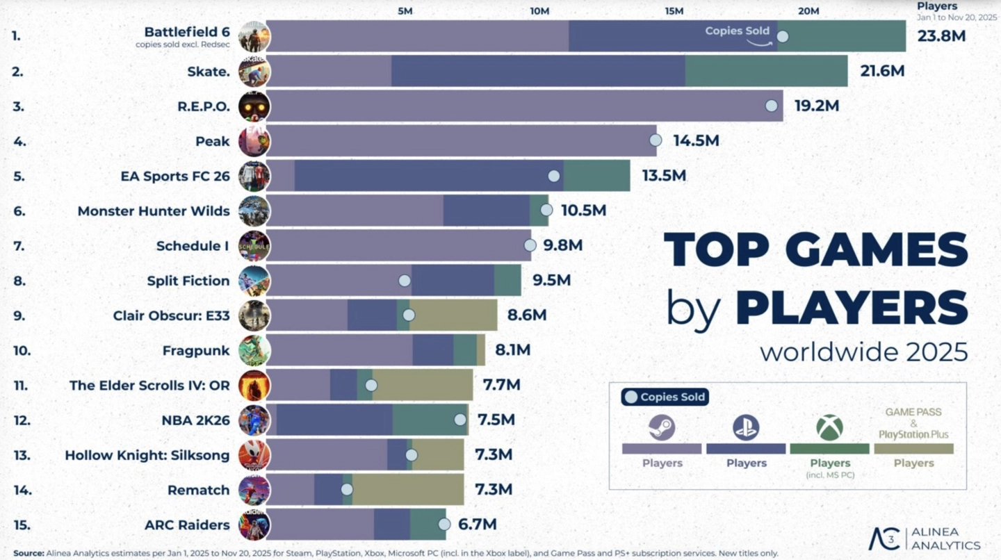 IT之家 12 月 29 日消息,数据分析公司 Alinea Analytics 发布 2025 年游戏市场分析报告,相关数据统计范围覆盖 2025 年 1 月 1 日至 11 月 20 日。 从玩家规模来看,2025 年玩家数量最多的游戏为《战地风云 6》(统计未包含免费大