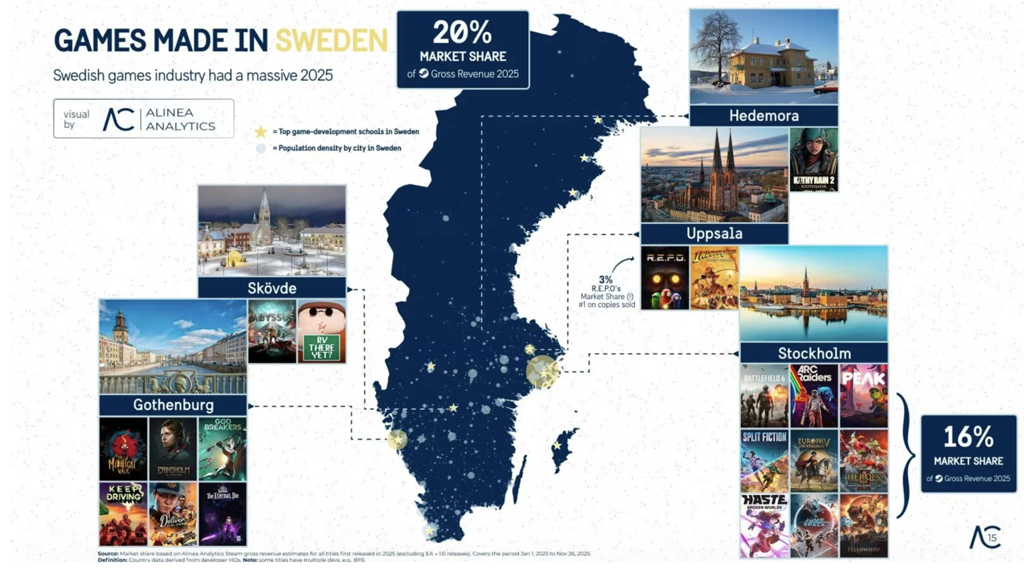 同时,数据显示,在 Steam 平台上,瑞典开发者推出的游戏作品约占 Steam 年度总收入的 20%,使瑞典成为 2025 年 Steam 平台全球营收最高的国家。