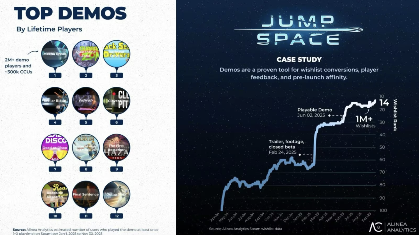 试玩数据方面,《解限机 Mecha Break》成为 2025 年最受欢迎的 Demo 作品(统计可能不包含公开测试),试玩玩家超过 200 万人,同时在线峰值人数突破 30 万。