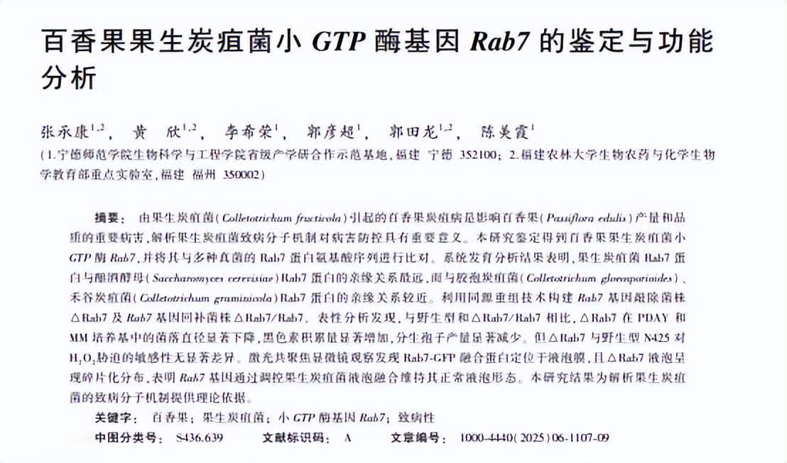 百香果果生炭疽菌小GTP酶基因Rab7的鉴定与功能分析 张承康,黄欣,李希荣,郭彦超, 郭田龙, 陈美霞 江苏农业学报 2025-06-30