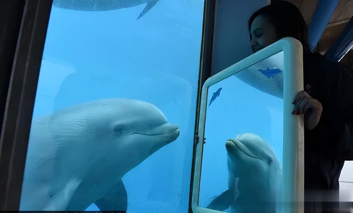 实验中的宽吻海豚被做了标记后,会专门游到镜子前,扭动身体从各个角度查看那个标记,行为和人类照镜子检查脸上有没有东西一模一样。