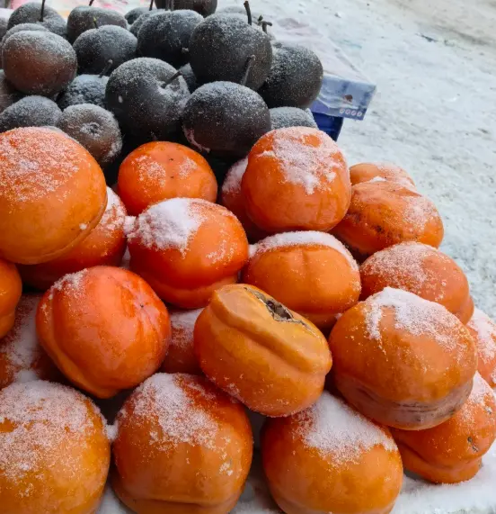 吃上一口,凉意顺着食道滑下去,简直就是纯天然的“哈根达斯”。而且,“柿柿如意”也是东北过年讨口彩的吉祥果,家家户户必备。