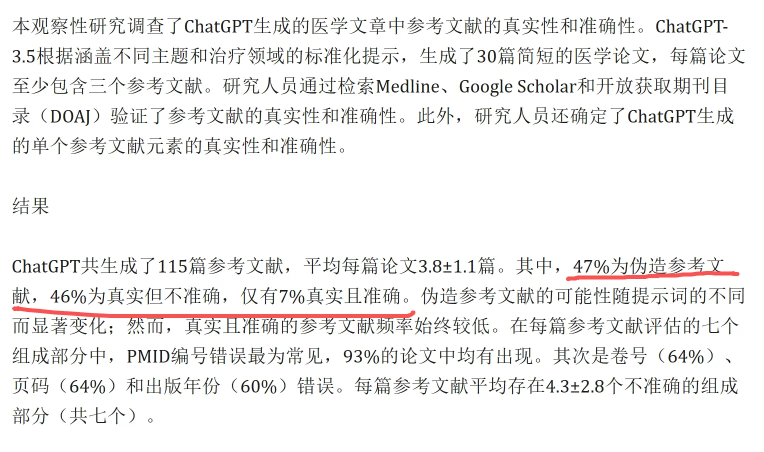 另一项医学内容研究报告 47% 的引用为完全伪造条目,而仅有极少部分同时真实且准确。