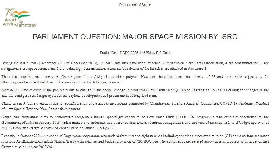 根据印度空间研究组织(ISRO)对信息权法(RTI)申请的说明情况来看,加甘扬(Gaganyaan)载人航天计划、加甘扬TV-D2(测试飞行器-D2)亚轨道测试任务的载人舱集成环境测试已完成,发射目标定为2026年第一季度。但是过后,给出了3次无人测试的先导任务,提出了相关性的任务正在推进之中,“力争”在2027年实现发射。