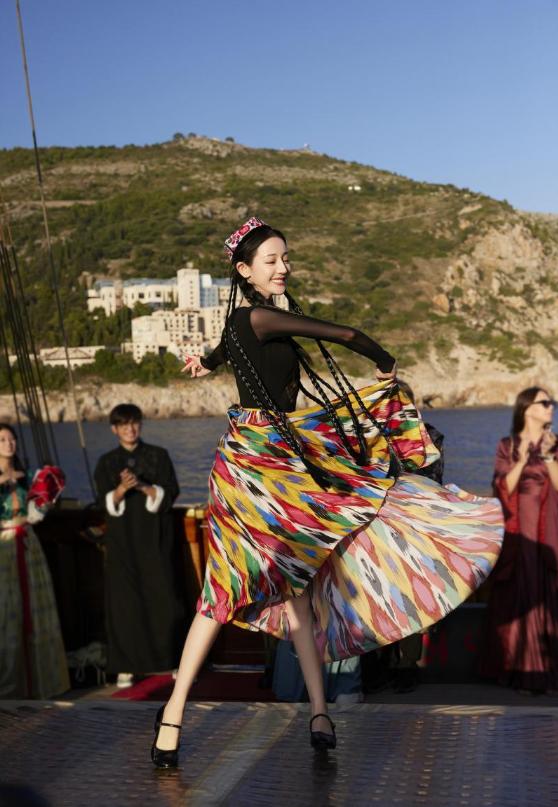 她一袭新疆服饰,在克罗地亚的船上跳起民族舞的画面。