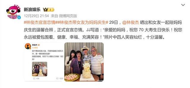 就在12月29日这天,林俊杰发了一组照片,庆祝母亲70岁生日。照片里,他和父母坐在一起,旁边还有一个年轻女孩,大家笑得特别开心。那女孩就是之前传过绯闻的七七,大概23岁左右,长得清秀,身材高挑,气质挺不错的。她把手轻轻搭在林俊杰母亲肩上,看起来已经很融入了这个家庭。林俊杰配的文字很简单,说爱就是不管好日子坏日子,都陪在身边,给最真的陪伴,还特别祝福母亲健康快乐,永远被爱包围着。这张四人合照一发出去,整个网络都热闹起来了,好多人觉得这不光是庆生,更是悄无声息地告诉大家,他找到属于自己的幸福了。