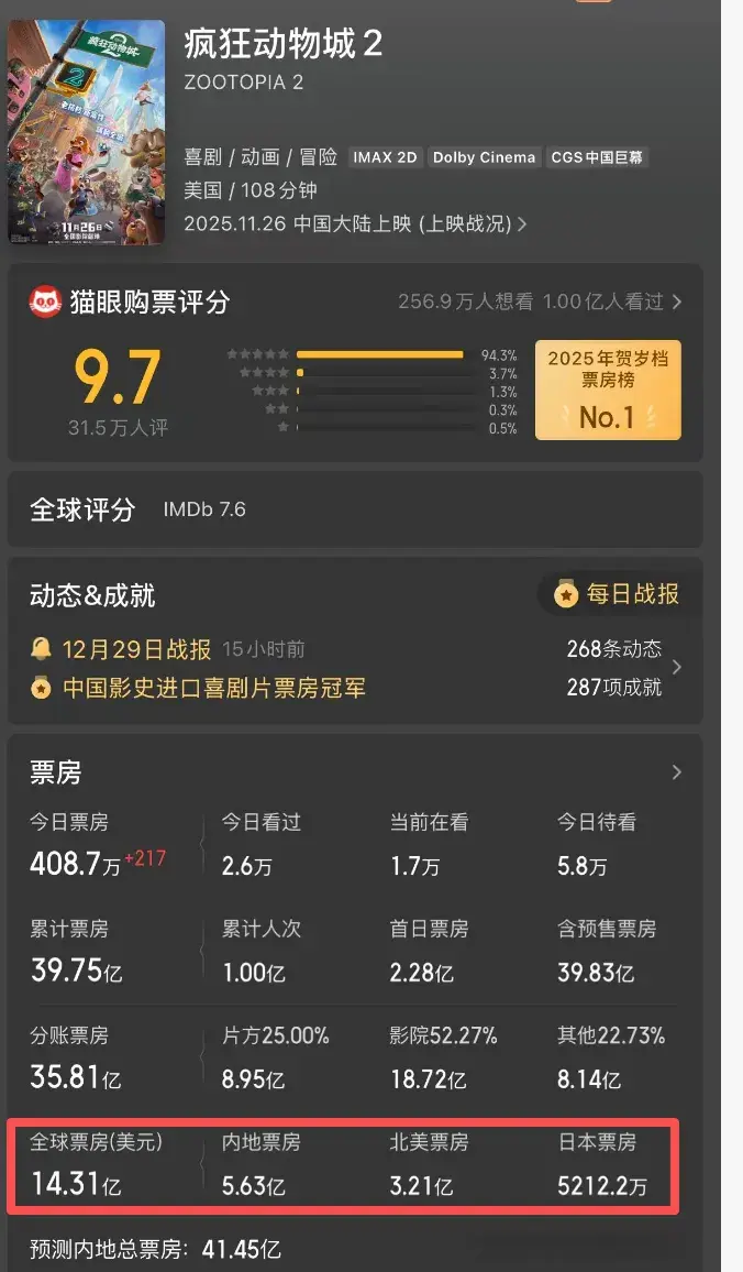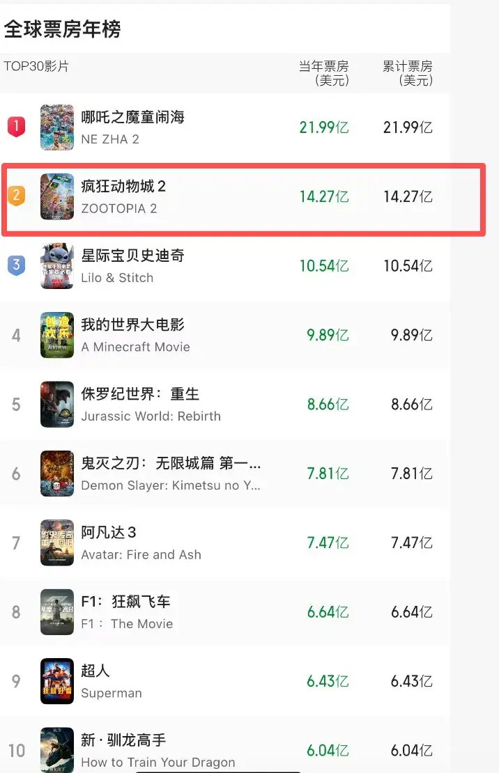 看看全球排行榜吧,下半年最出圈的成绩,就是《动物城2》了。
