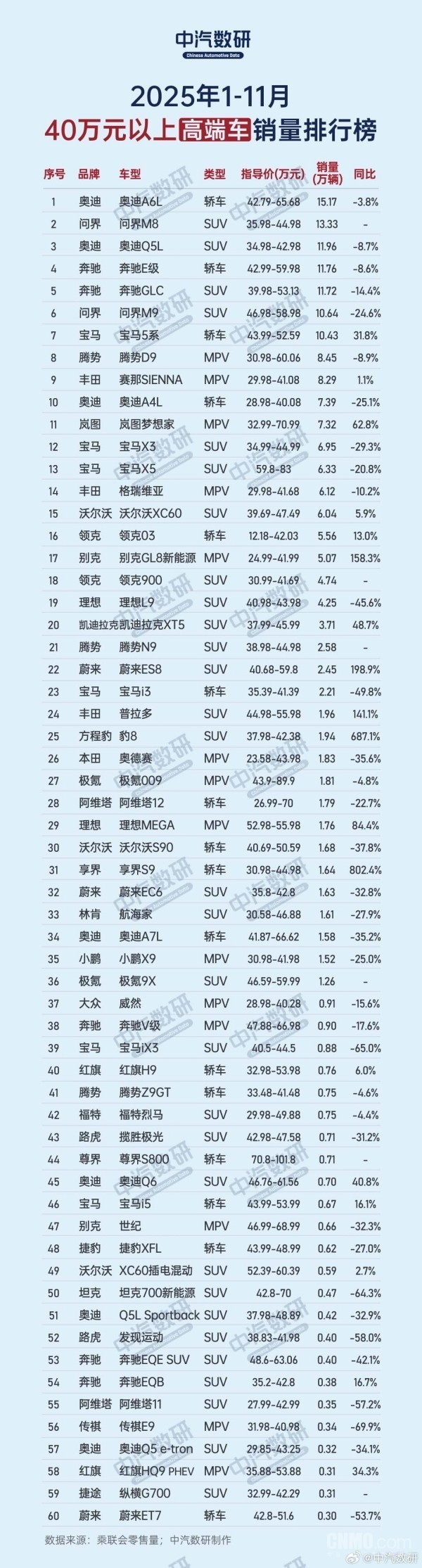 【CNMO科技消息】近日,中汽数研发布2025年1-11月40万元以上高端汽车市场销量TOP60。CNMO注意到,合资燃油车仍占市场主导地位,但自主新能源正在加速突围。例如,问界M8以13.33万辆的销量位居榜单第二。