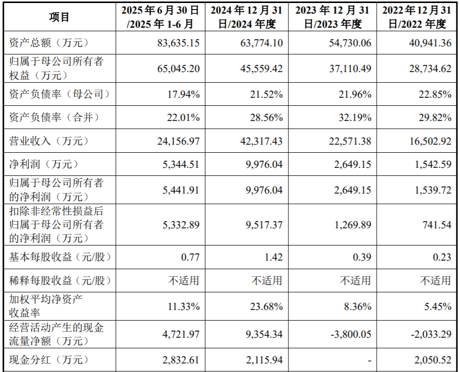 业绩方面,2022年至2024年及2025年上半年(报告期内),公司营业收入分别为1.65亿元、2.26亿元、4.23亿元和2.42亿元,2022至2024年复合增长率达60.13%;归属于母公司所有者的净利润分别为1539.72万元、2649.15万元、9976.04万元和5441.91万元,2024年归母净利增长276.6%。