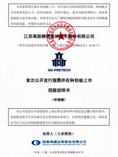 瑞财经 王敏 12月29日,据上交所,江苏高凯精密流体技术股份有限公司(以下简称“高凯技术”)科创板IPO获受理,保荐机构为国泰海通,保荐代表人为徐亮庭、江煌。 本次IPO,高凯技术拟使用募集资金金额15亿元,其