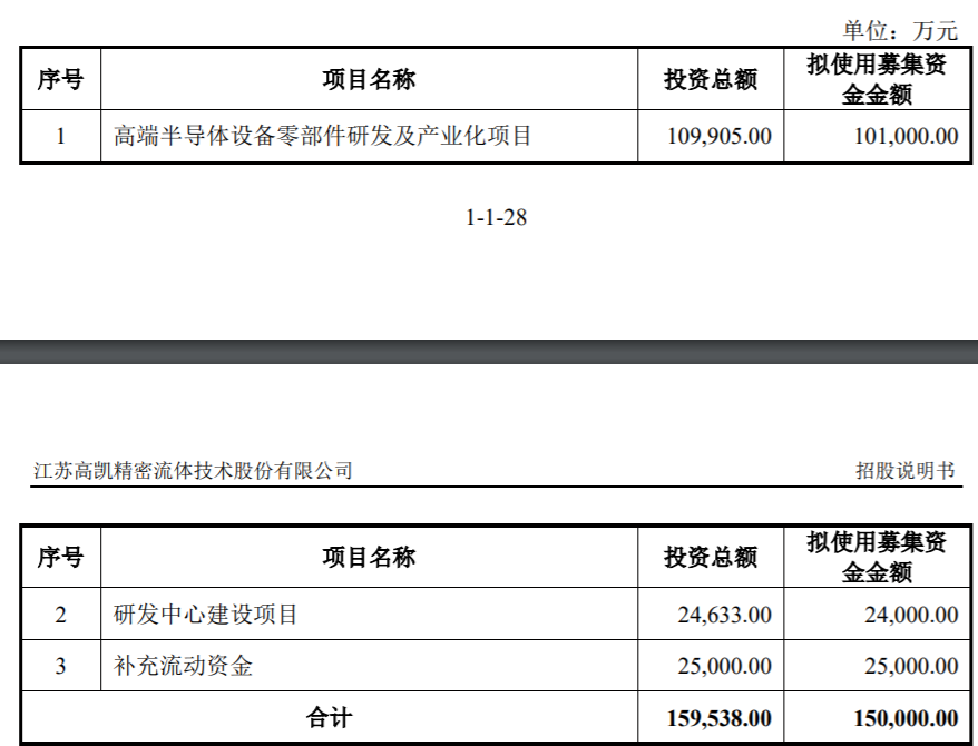 本次IPO,高凯技术拟使用募集资金金额15亿元,其中10.1亿元用于高端半导体设备零部件研发及产业化项目、2.4亿元研发中心建设项目及2.5亿元补充流动资金。