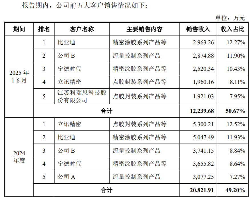 报告期内,公司前五大客户合计销售金额分别为0.63亿元、1.02亿元、2.08亿元和1.22亿元,占比分别为37.98%、44.99%、49.20%和50.67%,客户集中度较低。其中大客户包括比亚迪、宁德时代、立讯精密等。