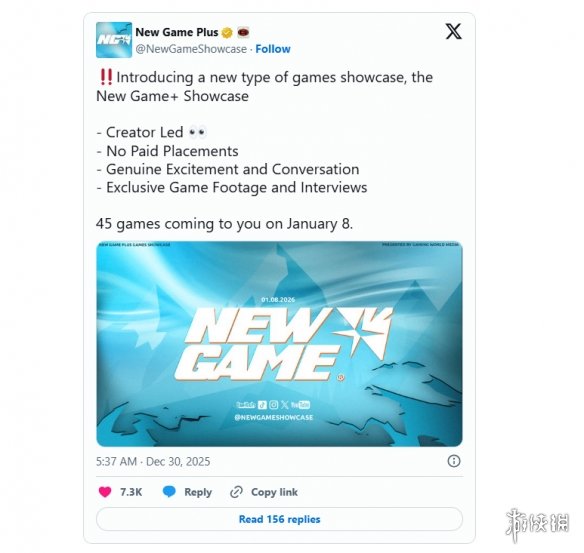 2026年1月的游戏界开场异常繁忙,在备受期待的Xbox开发者直面会之外,一场全新的游戏展示活动已正式揭晓。名为 “New Game+” 的独立展示会将于北京时间1月9日凌晨1点(太平洋时间1月8日上午10点)通过其官方YouTube频道