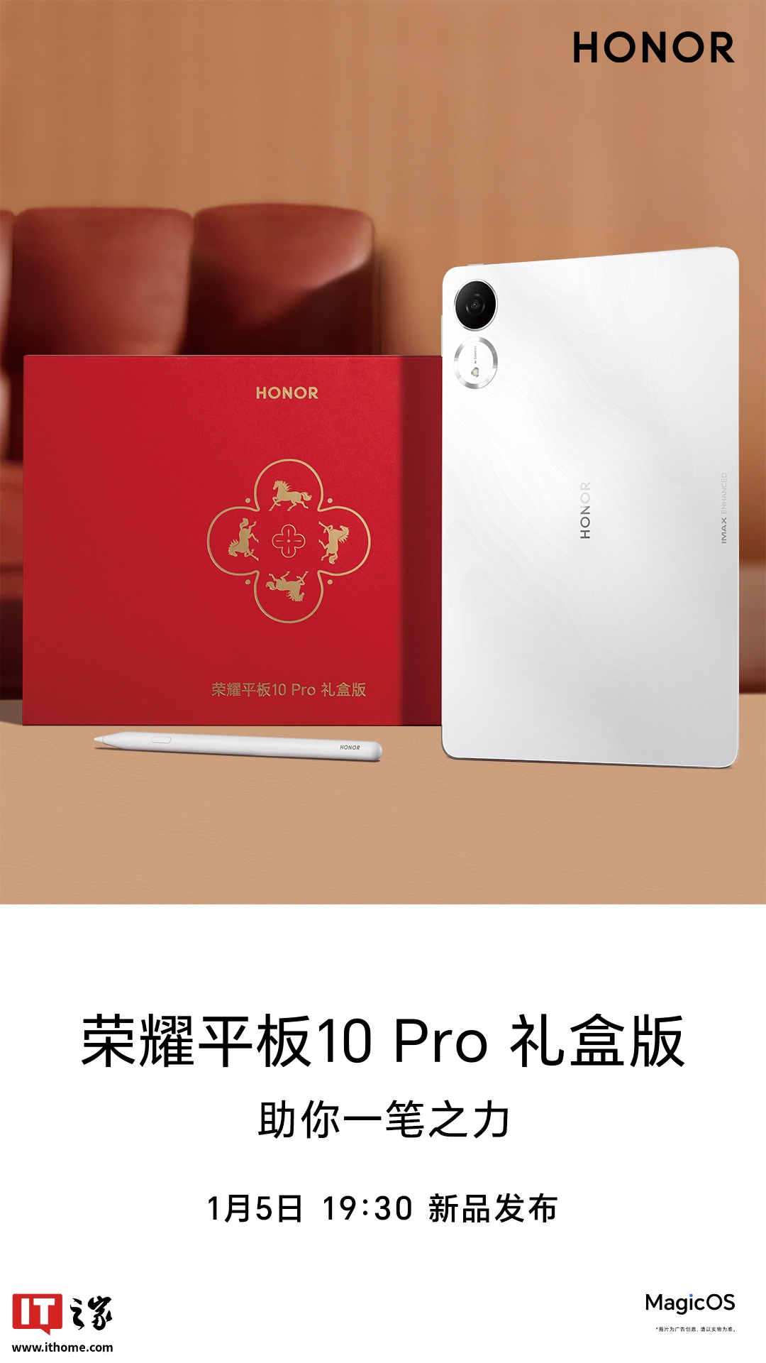 值得一提的是,荣耀平板 10 Pro 还将推出惊喜款新春限定礼盒套装,内置全新 Magic-Pencil 4s 手写笔,新品已定档 1 月 5 日发布会亮相。