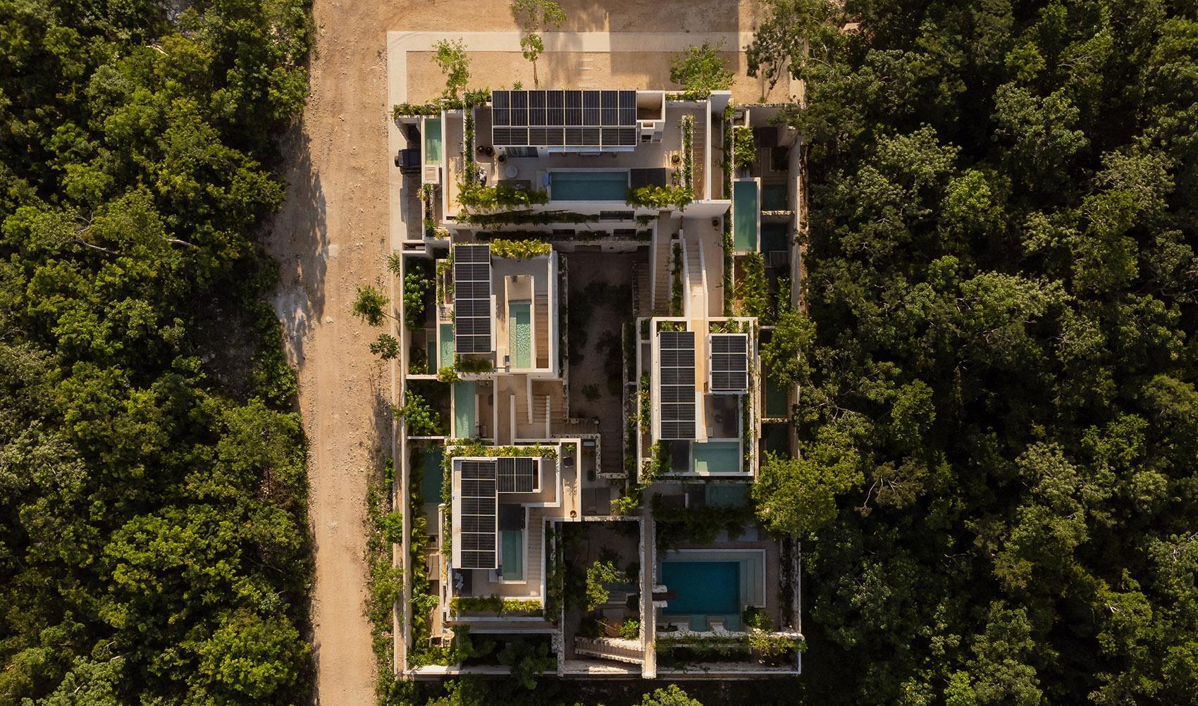 泳池度假屋围绕一个中央庭院展开,内部空间被分割为更小的庭院与角落,串联起曲折的小径,最终通向一个带游泳池和休闲空间的半公共区域。阶梯式布局,确保每户享有充分日照与对流清风。立面融入种植槽,让建筑自然退隐于绿意之后。