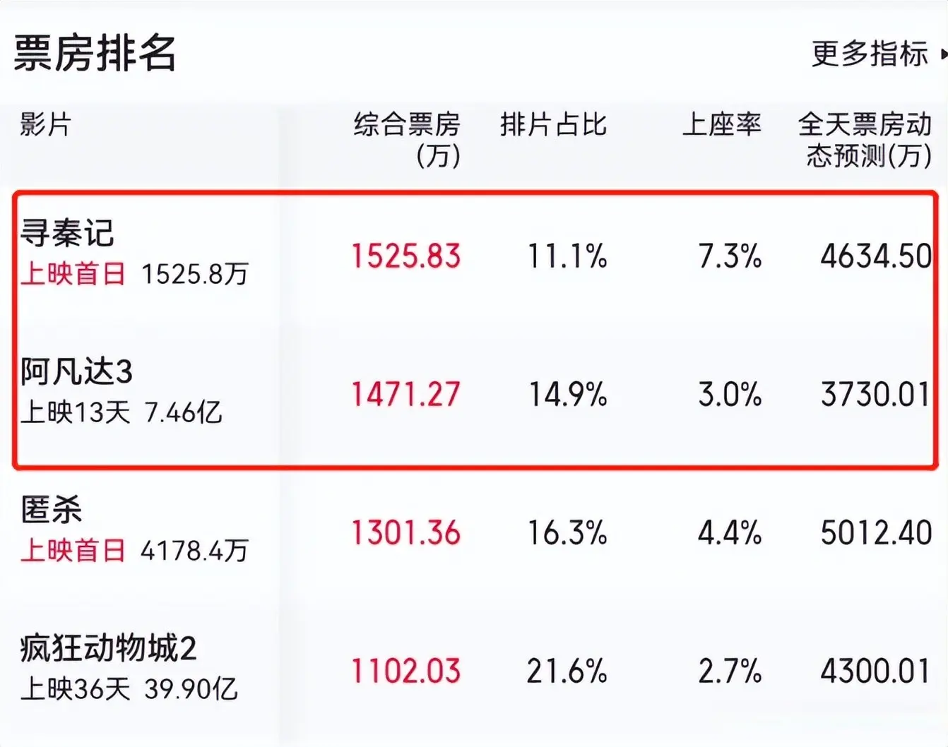 对比之下,《阿凡达3》的排片还是要略高一些,但,上映首日的《寻秦记》黄金档比前者多,上座率更是当之无愧的冠军。
