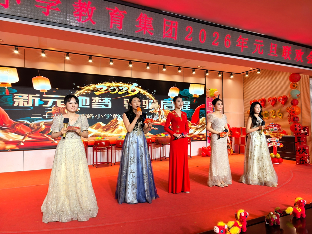 龙马精神迎新春,骐骥驰骋启新程。为丰富校园文化生活,促进学生全面发展,凝聚教师团队力量,展现师生昂扬向上的精神风貌,2025年12月31日,二七区汝河路小学教育集团举办以“新元驰梦 骐骥启程”为主题的2026年元旦联欢会。全体教职工欢聚一堂,共贺新年。