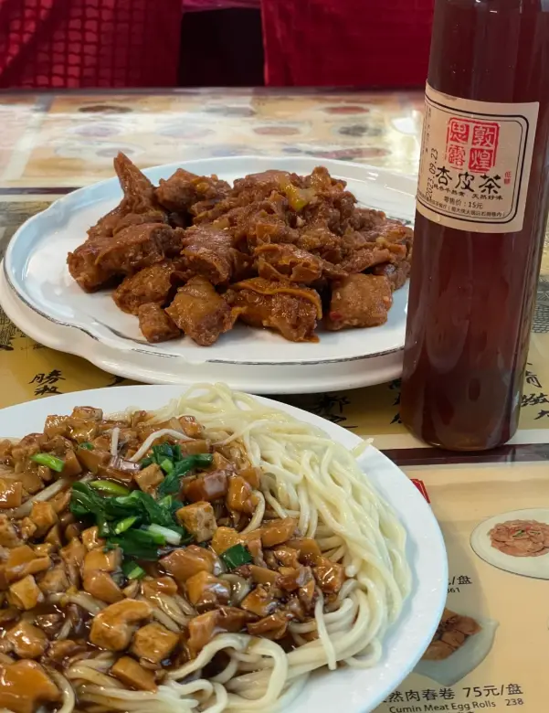而与之对话的,是一杯冰镇杏皮水。敦煌盛产李广杏,杏皮水便是用杏干、山楂、冰糖等熬制后冰镇而成的当地饮品。它色泽清亮如琥珀,入口冰凉,酸甜生津,有浓郁的杏子果香,又带着一丝若有若无的草药般的回甘,清爽解腻。