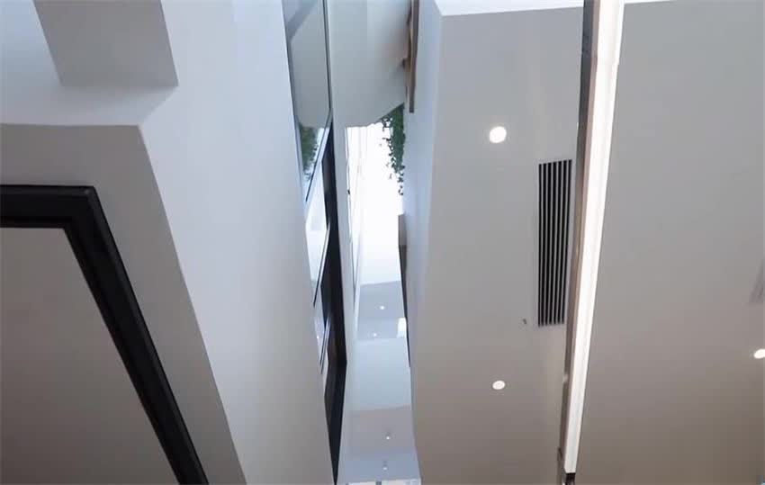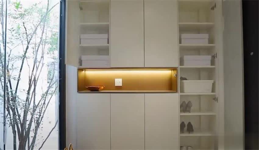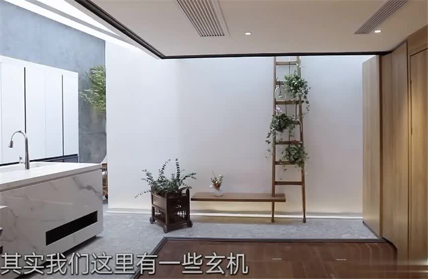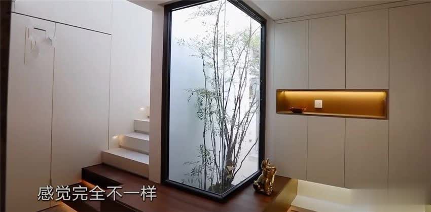 推门而入,入户口是下沉玄关,正对大门的玻璃映衬着外侧的绿植,颇为雅致;