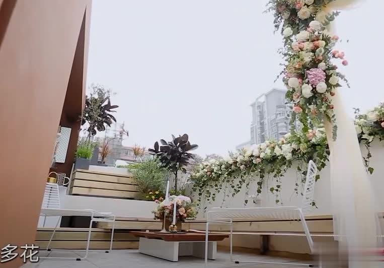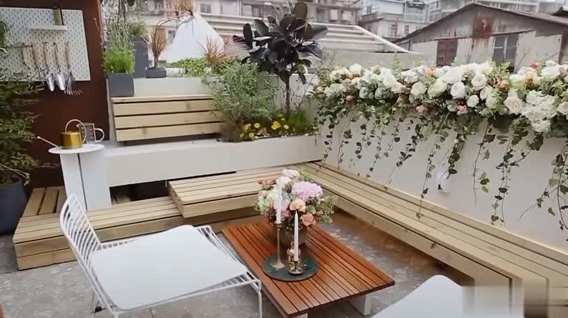 再往上走还有一个小露台,沿墙做一排卡座,搭配上小方几和凳子,外加成片的花朵和绿植,犹如一个天台花园,宁静浪漫。