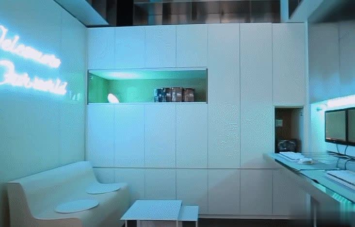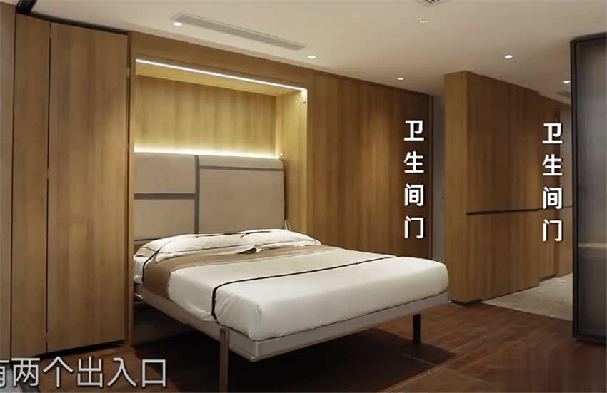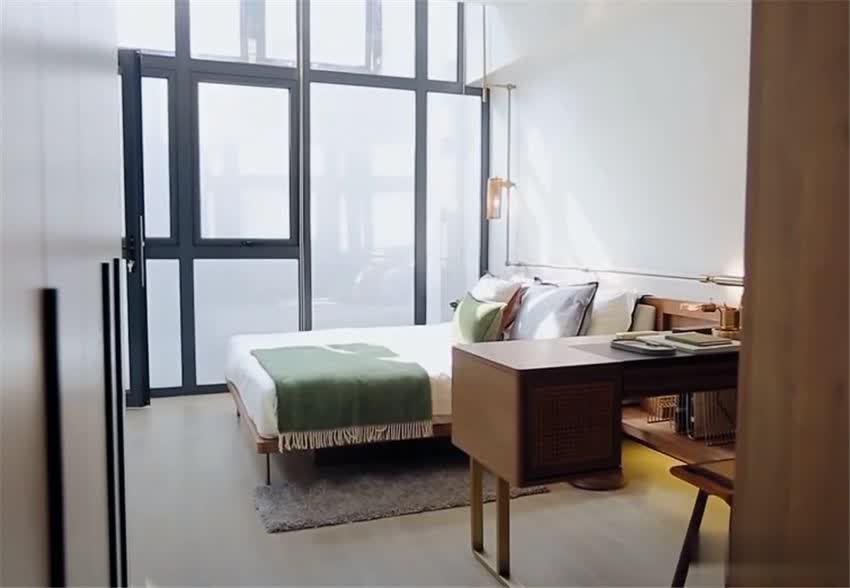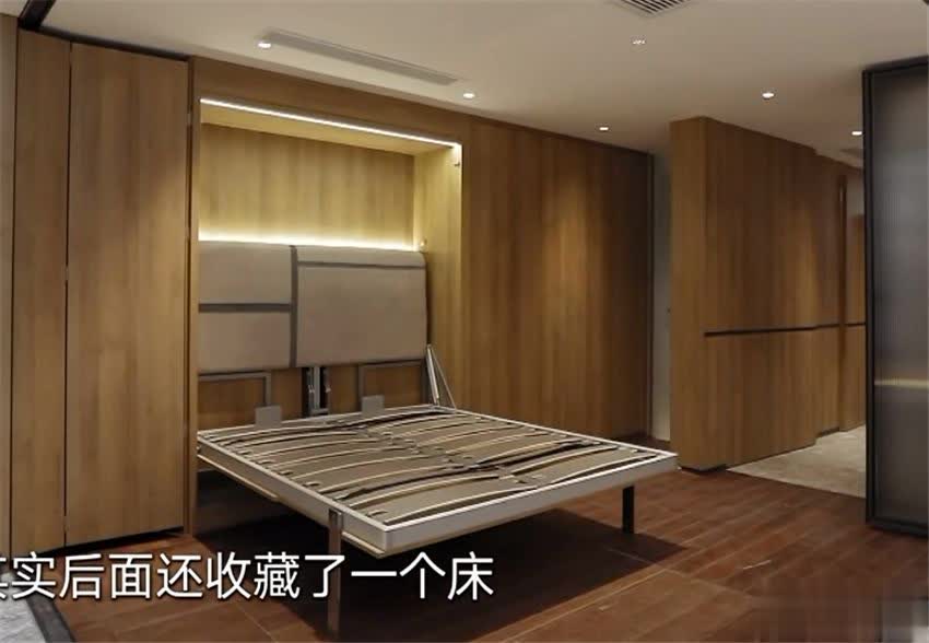 在厨房对面空旷的地方,其实也是一有玄机。墙壁上是墨菲床,四面轨道将玻璃门拉开,形成密闭的卧室。