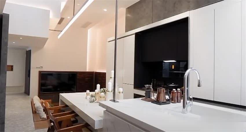 正对客厅的是开放式厨房,整面墙的橱柜,将家电嵌入在内,视觉统一,整洁美观;