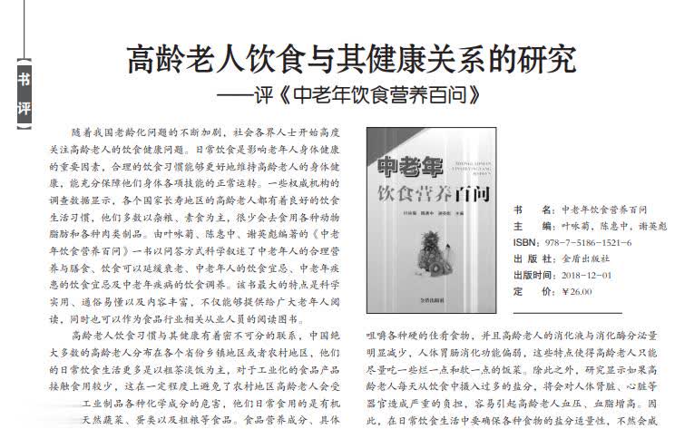 [1]迟玉芳.高龄老人饮食与其健康关系的研究——评《中老年饮食营养百问》[J].食品工业,2021