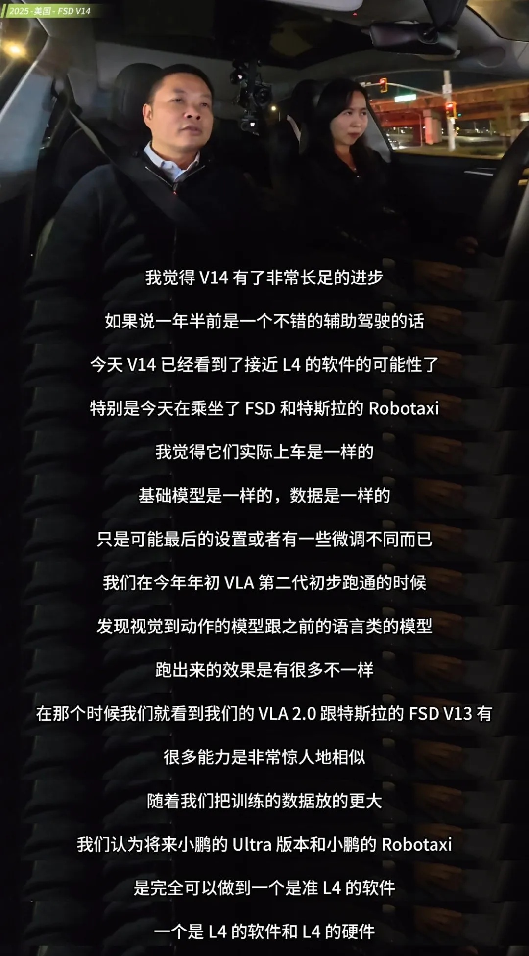 2024年,何小鹏也曾赴美测评特斯拉FSD V12,相比上次,这次他体验FSD V14的感受又有所不同。