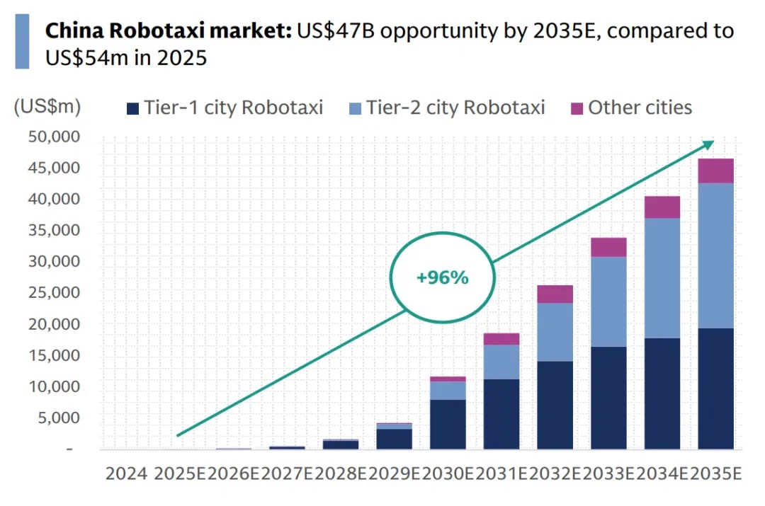 据高盛报告预测,中国自动驾驶市场的规模将从2025年的5400万美元增长到2035年的470亿美元,有望成为全球最大的自动驾驶出行市场。瑞士银行预测,到2030年末,中国Robotaxi车队总规模或达400万辆;如果Robotaxi实现全国部署,市场规模可达1800亿至2000亿美元。