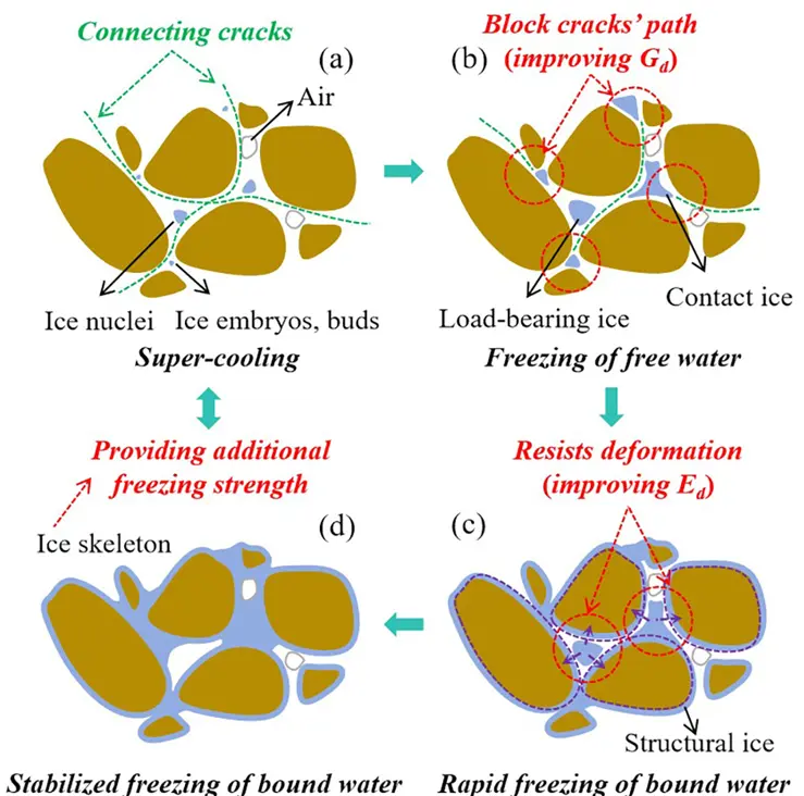 •   孔隙水的冻结顺序决定冰骨架形态及其结构完整性。