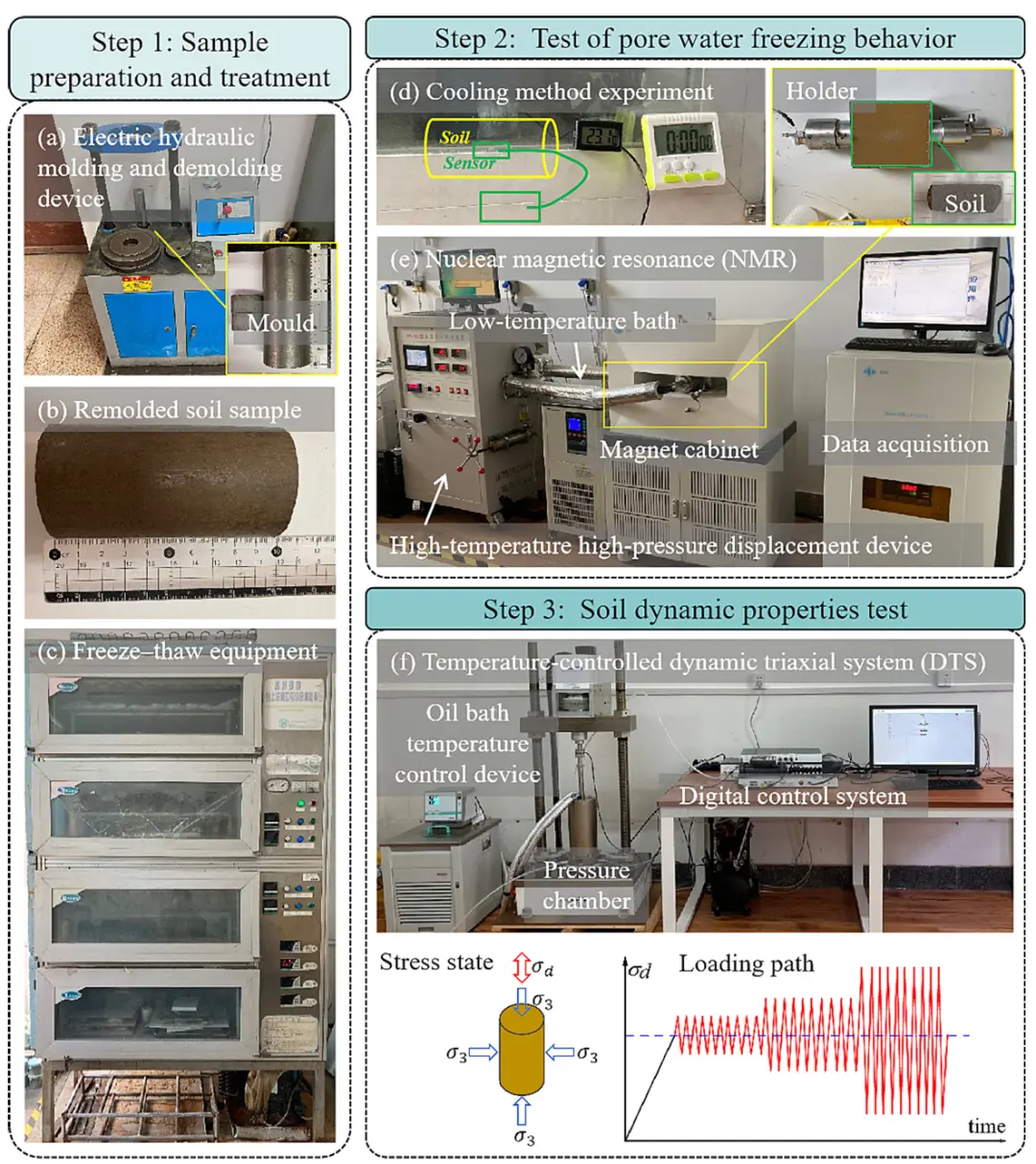 Fig. 3. Diagram of the sample preparation and experimental procedure: (a) electric hydraulic molding and demolding device for soil preparation; (b) remolded soil sample; (c) freeze-thaw equipment; (d) cooling method experiment; (e) nuclear magnetic resonance (NMR); (f) temperature-controlled dynamic triaxial system (DTS).