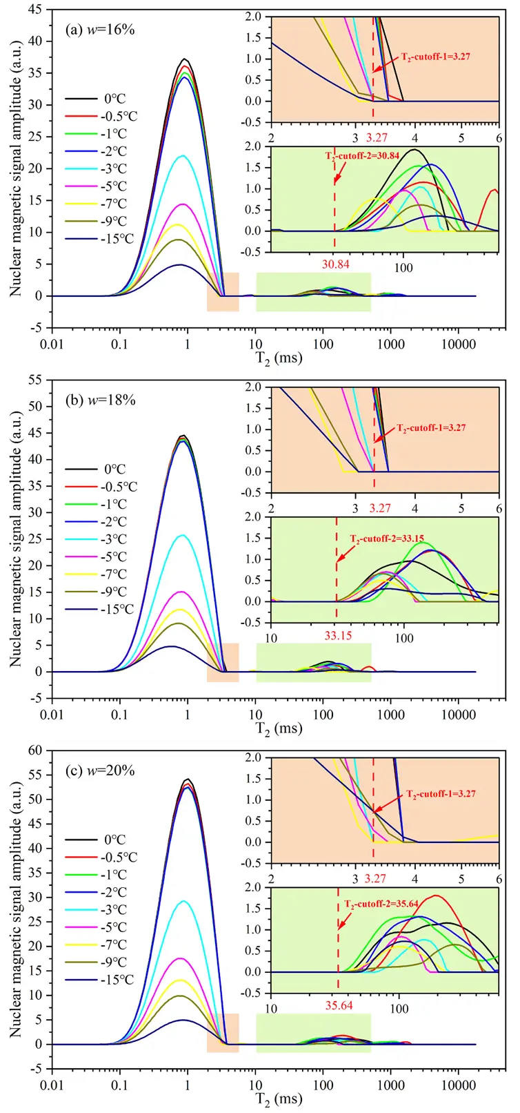Fig. 8. The T distribution curves of soil samples with water contents (w) of (a) 16 %, (b) 18 %, and (c) 20 % during the freezing process.