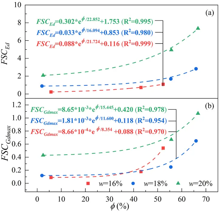 Fig. 15. The variation curves of the Freezing Strengthening Coefficient (FSC) of (a) E and (b) G with the ice saturation (∅) in soils with different water contents (w)