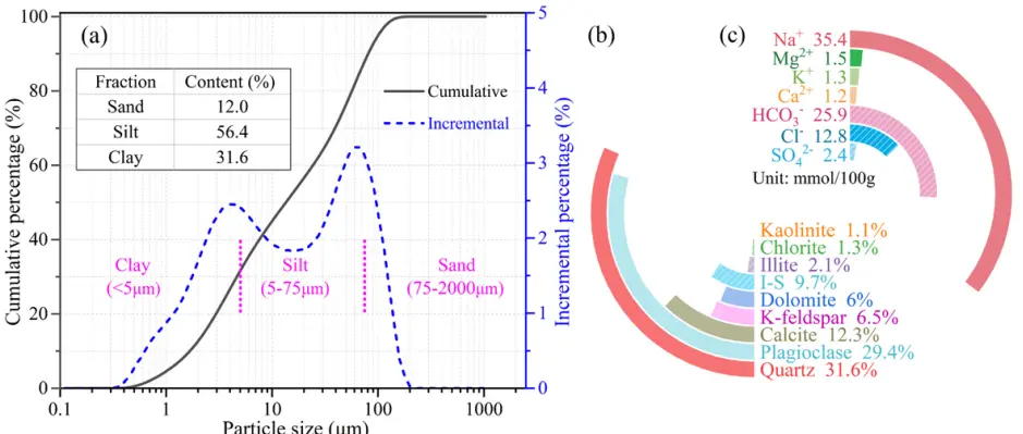 Fig. 2. Characterization of tested saline soil samples: (a) particle size distribution curve; (b) mineral composition; (c) soluble ion components.