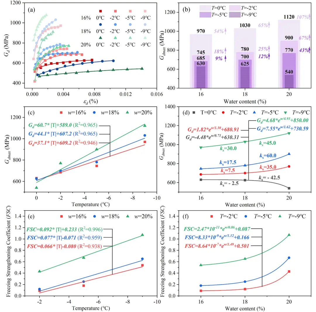 Fig. 12. (a) The variation curves of G with strain; (b) G of soil samples with different water contents (w) at various temperatures (T); the variations in G with (c) T and (d) w; the variations in Freezing Strengthening Coefficient (FSC) of G with (e) T and (f) w.