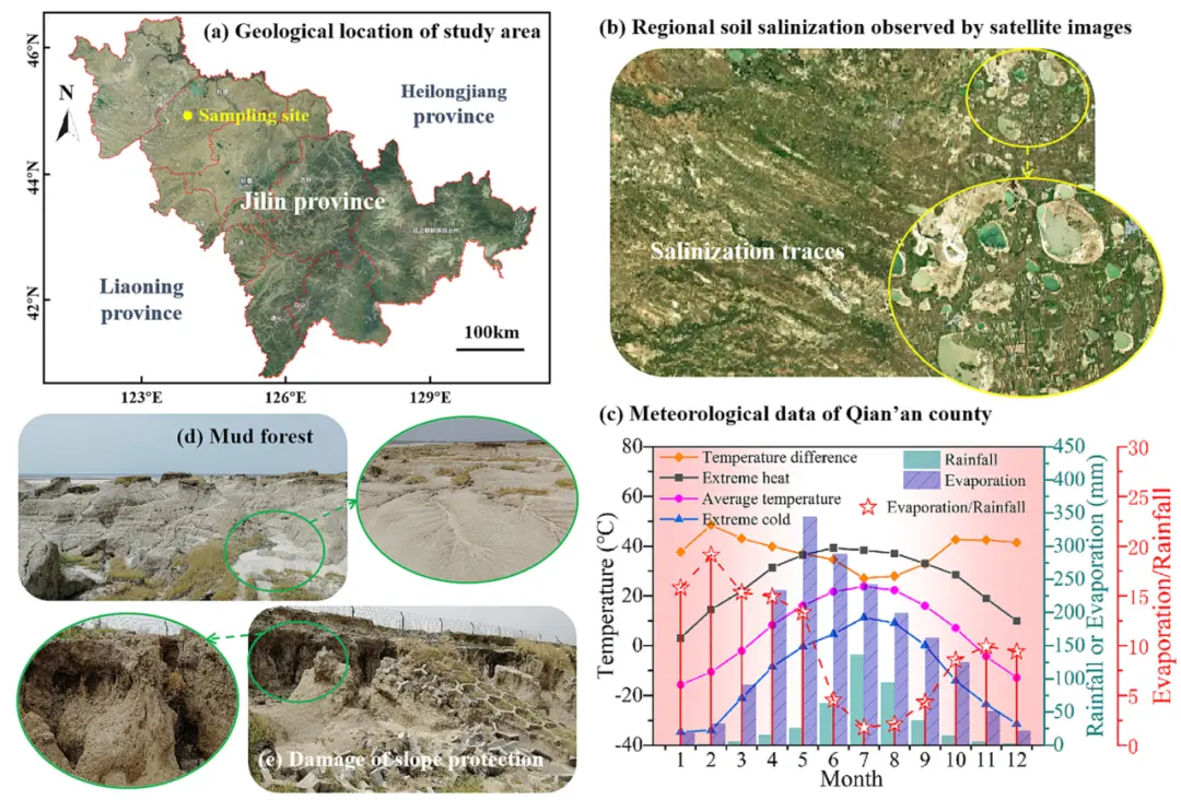 Fig. 1. (a) Geological location of study area; (b) regional soil salinization observed by satellite images; (c) meteorological data of Qian'an county; (d) mud forest landscape; (e) damage to slope protection of the open water channel.