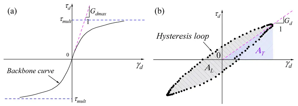 Fig. 5. (a) The basic form of the Hardin-Drnevich hyperbolic model; (b) the calculation of the damping ratio (λ)