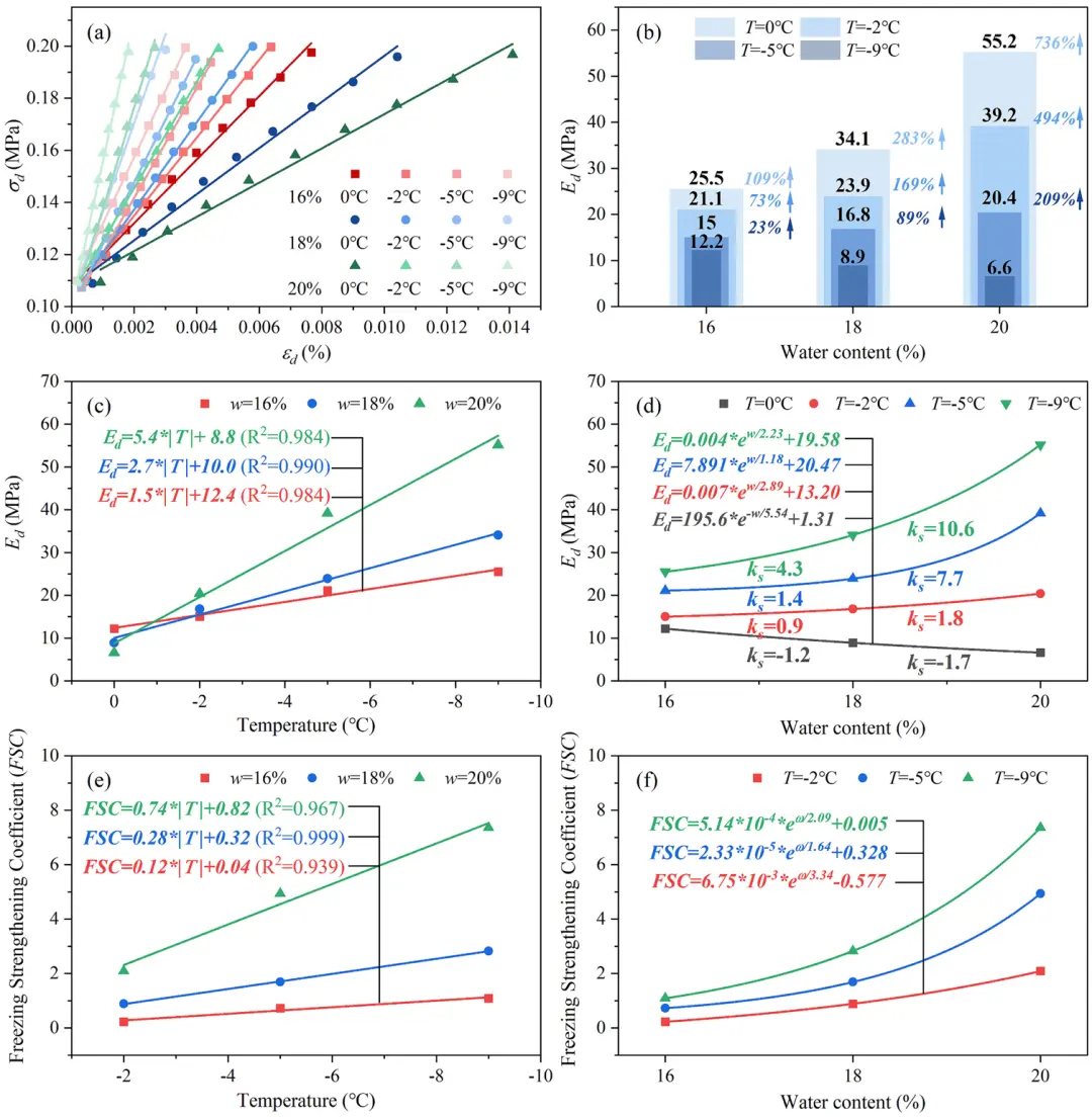Fig. 11. (a) The stress-strain curves; (b) E of soil samples with different water contents (w) at various temperatures (T); the variations in E with (c) T and (d)w; the variations in Freezing Strengthening Coefficient (FSC) of E with (e) T and (f) w.