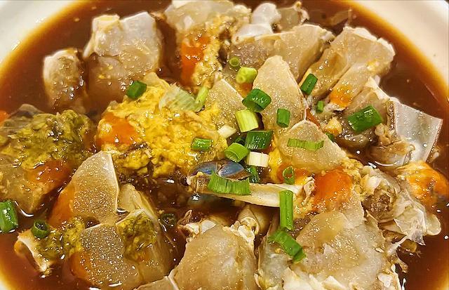芙蓉蚘蠓是温州的一道传统名菜,有着上千年历史。青蟹在当地方言中被称为蚘蠓,这道菜以新鲜青蟹、鸡蛋为主料,先把青蟹切成小块,三四个鸡蛋打散,加食盐、温水搅匀,把青蟹摆入蛋液中,上锅蒸至变色凝固,最后放入猪油、鸡精等调味即可,摆盘精美,蛋羹的滑嫩配上青蟹的鲜甜,令人陶醉其中!