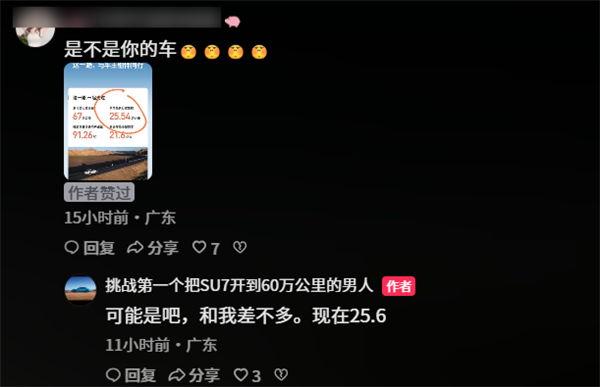 这名车主应该就是抖音博主“挑战第一个把SU7开到60万公里的男人”,他称自己目前跑了25.6万公里。