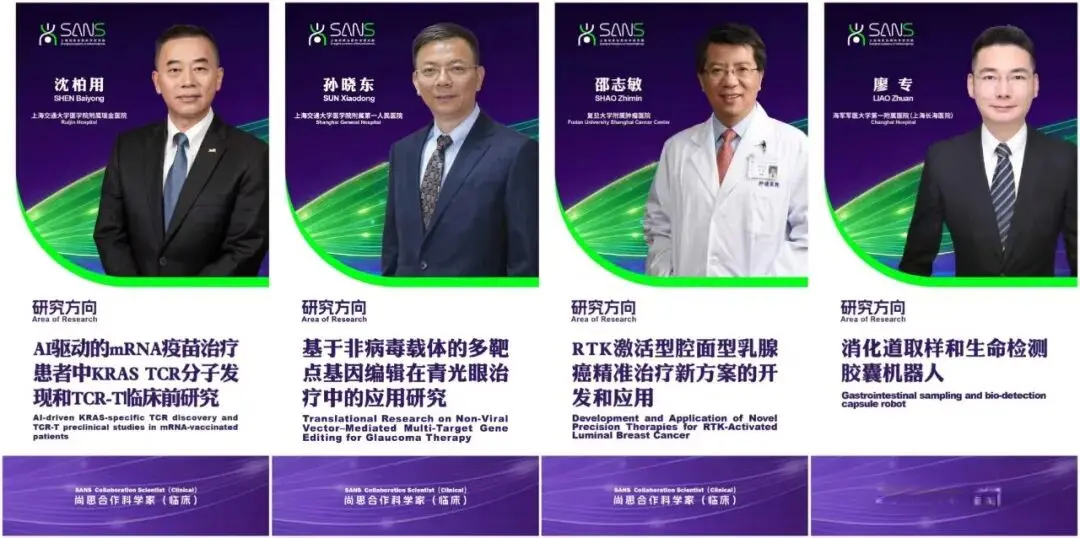 在入选项目的基础上,尚思又进一步通过多轮的项目辅导和建议,以及来自科学界、临床界、产业界的专家评审,最终选拔出首批“尚思合作科学家(临床)”:长海医院的廖专(上消化道胶囊内镜技术的拓展和应用);上海市第一人民医院的孙晓东(青光眼的多基因疗法);上海交通大学附属瑞金医院的沈柏用(新抗原mRNA疫苗结合TCR-T治疗晚期肝癌);复旦大学附属肿瘤医院邵志敏(腔面型乳腺癌的分子病理分型和药物应用)。尚思认为,这些研究者的未来研究计划,源自真实的临床问题、针对明确的未满足的临床需求、具备相对清晰的开发和应用路径,恰是尚思认为最应当支持的“医生做科研”的模式。