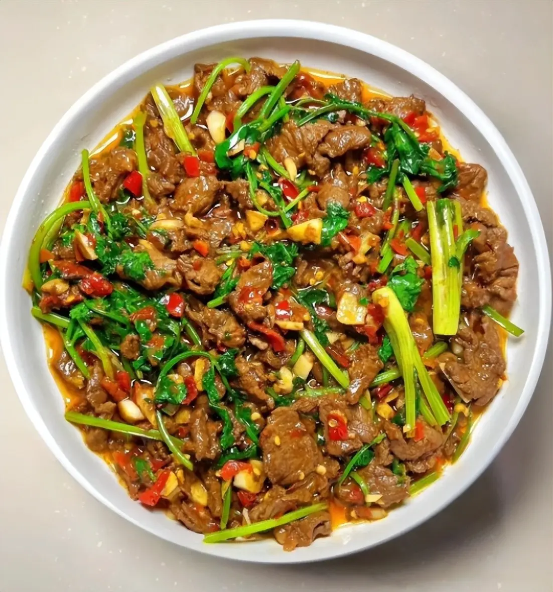 5. 将炒过的牛肉片重新倒入锅中,与姜蒜一起翻炒均匀。