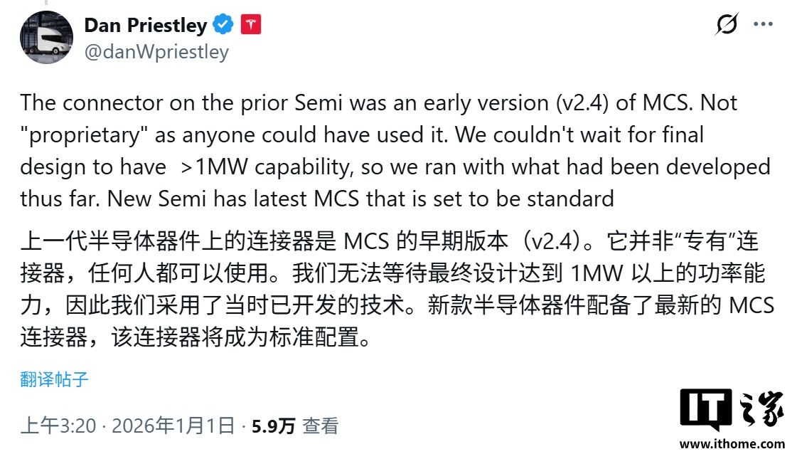 特斯拉 Semi 项目负责人 Dan Priestley 证实,新版卡车已标配最新的兆瓦级充电系统(MCS)接口,彻底取代了早期的 v2.4 版本。
