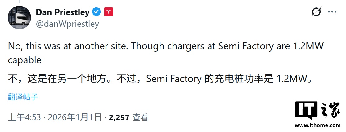 IT之家 1 月 1 日消息,特斯拉 Semi 官方 X 账号昨日(2025 年 12 月 31 日)发布推文,分享了一段视频,展示了 Semi 电动卡车在 Megacharger 充电站的实测表现,其持续充电功率达到惊人的 1.2 兆瓦(MW)。