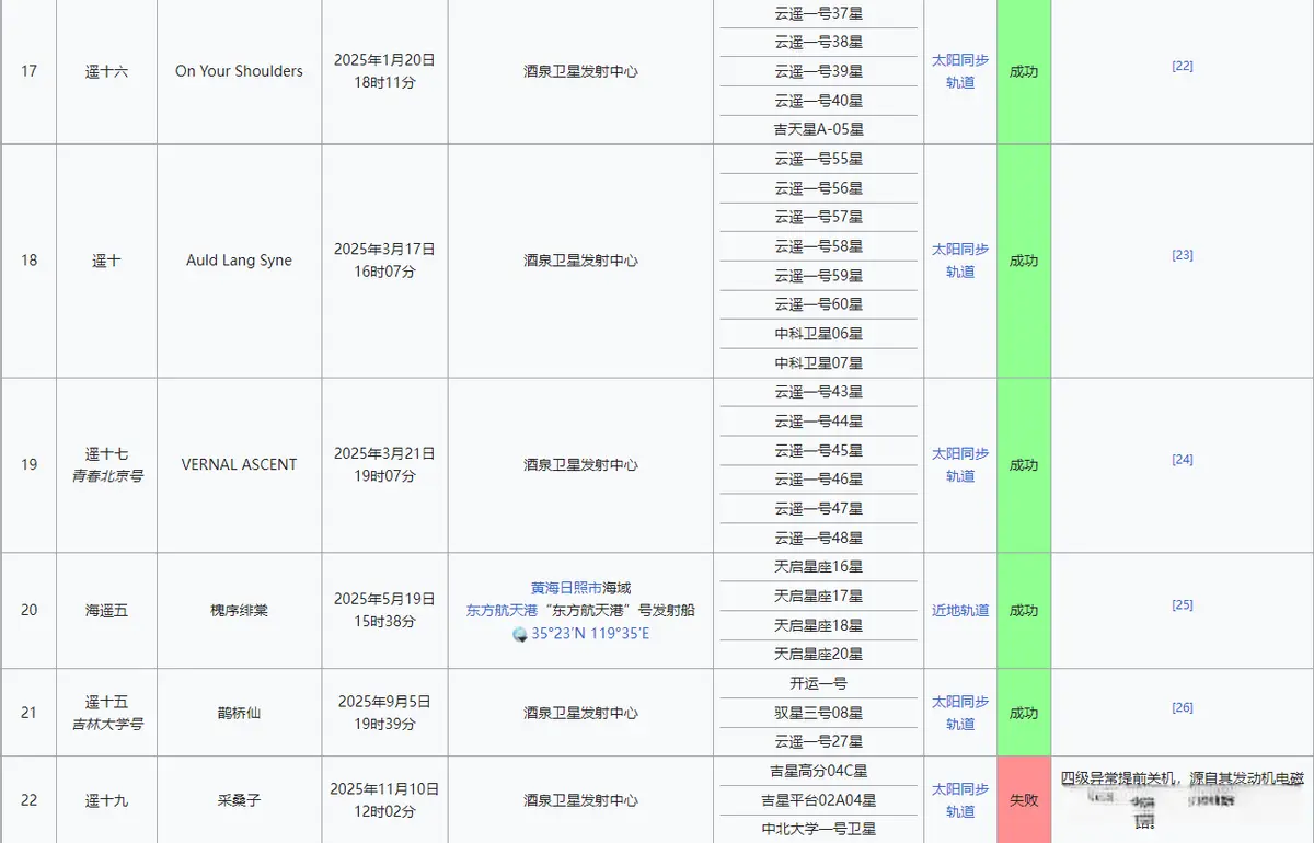 要说商业火箭里面执行任务最多的火箭,那应该还是谷神星一号运载火箭,2025年一共执行了7次发射任务,其中有6次成功将26颗卫星送入预定轨道,失败的那一次丢失了3颗卫星,大家可以从上面这张图上看到具体发射了哪些卫星。
