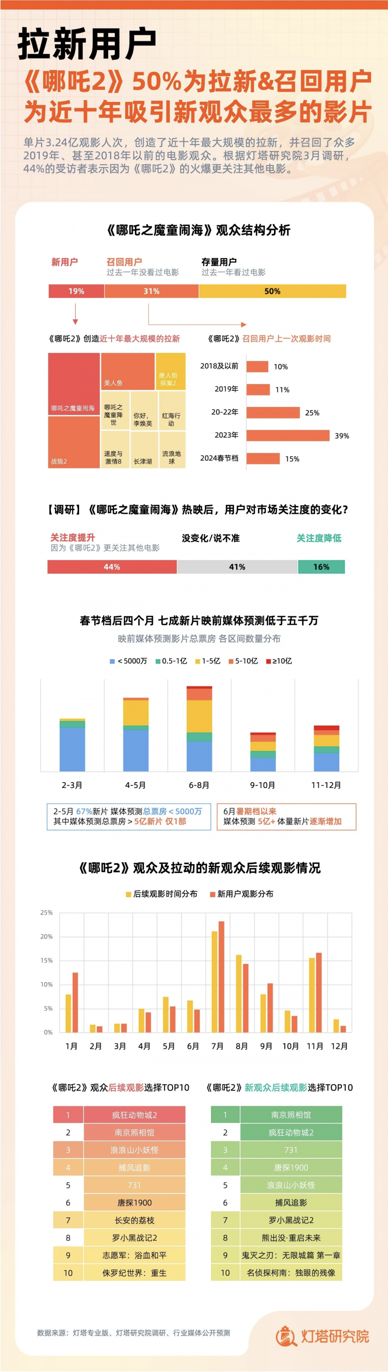 拉新用户方面,《哪吒之魔童闹海》(简称《哪吒2》)50%为拉新&召回用户,单片3.24亿观影人次创造近十年最大规模拉新,同时召回了众多2019年及更早的电影观众。灯塔研究院3月调研显示,44%的受访者表示因《哪吒2》的火爆更关注其他电影。